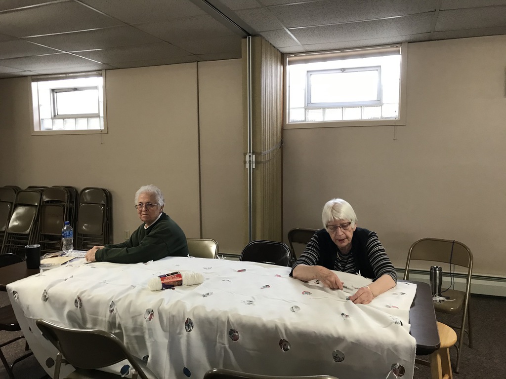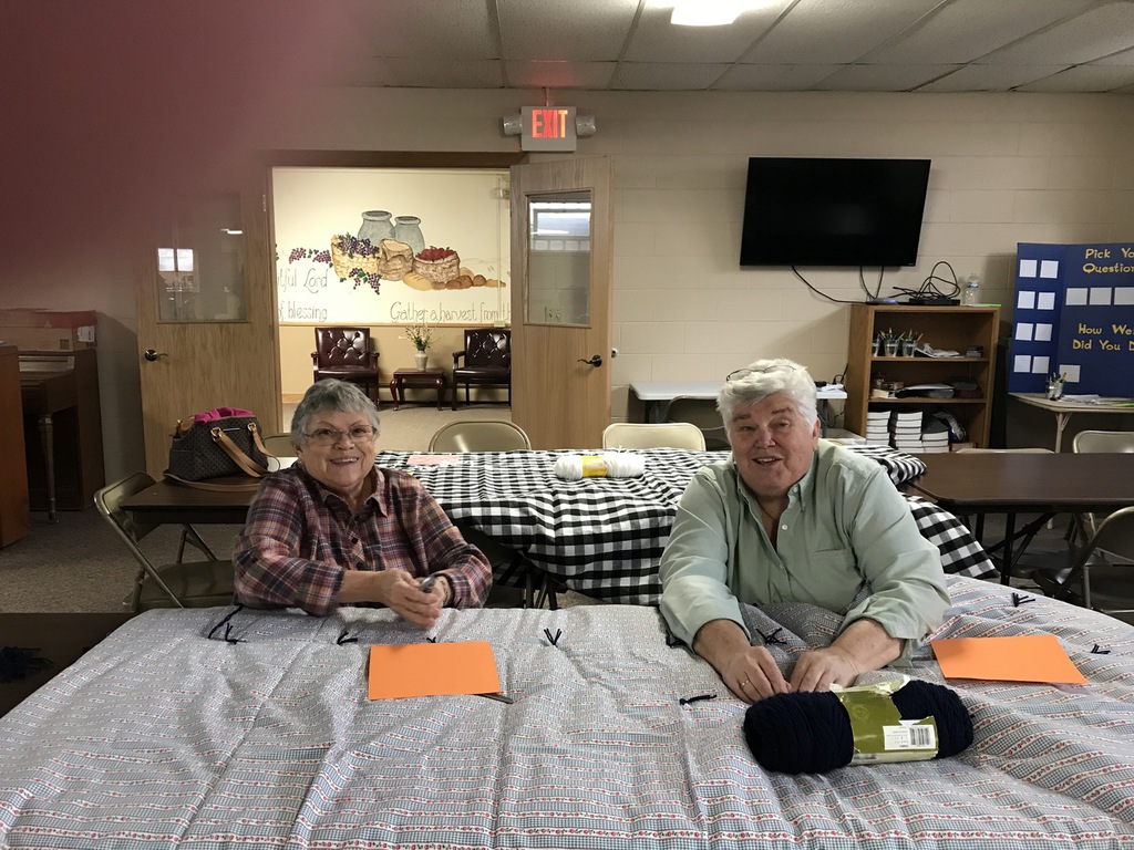 Next, when you have the tops and bottoms ready, please take them to the church basement. There will be a marked table to place them on. A few women will assemble the layers and sew them together. This will allow you to take them home to be tied. They will be placed in the narthex with the yarn. When done, you can place them in the pews.